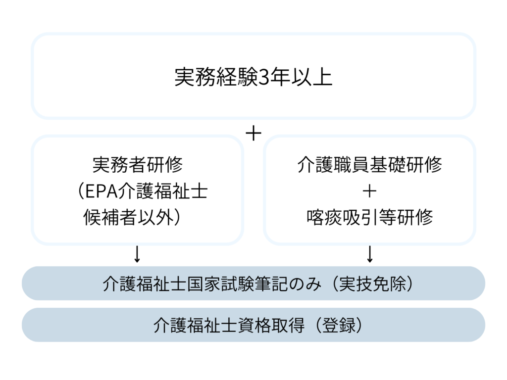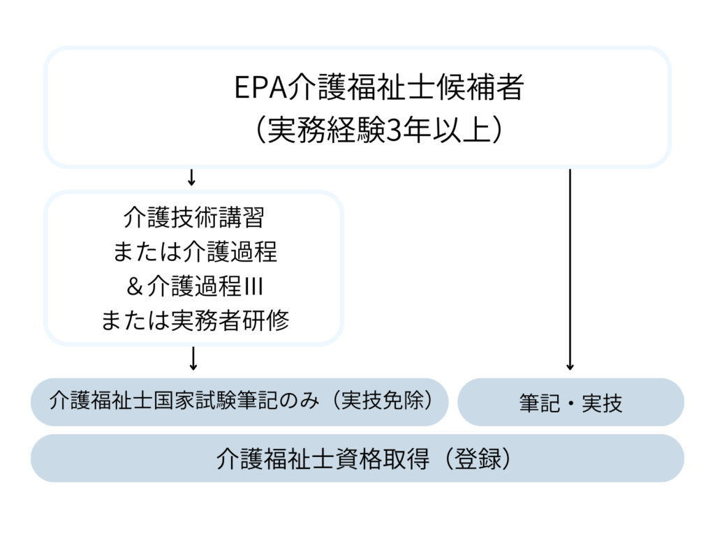 実務経験は3年以上が条件で実務経験ルートと同じですが、EPA介護福祉士候補者は実務者研修もしくは介護技術講習または介護過程・介護過程Ⅲを受けることで実技試験免除の筆記試験のみで国家試験を受験できます。それがない場合でも受験はできますが、実技試験も受けないといけません。