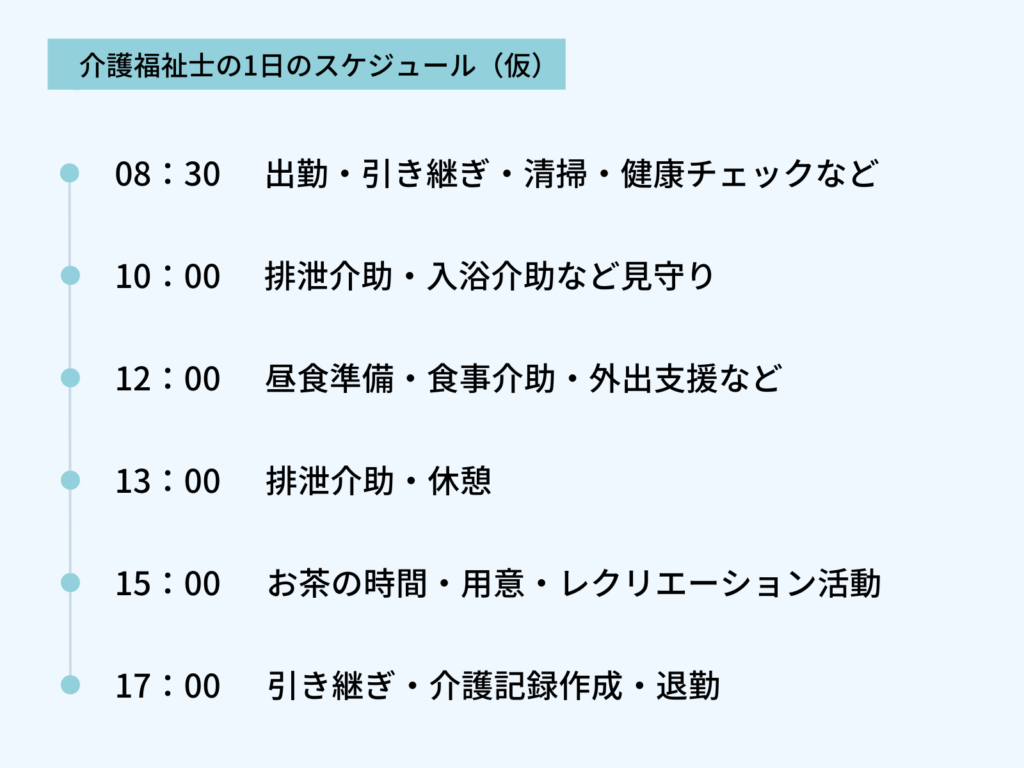 基本的な介護福祉士の1日のスケジュールを以下にまとめたので、早速みていきましょう。