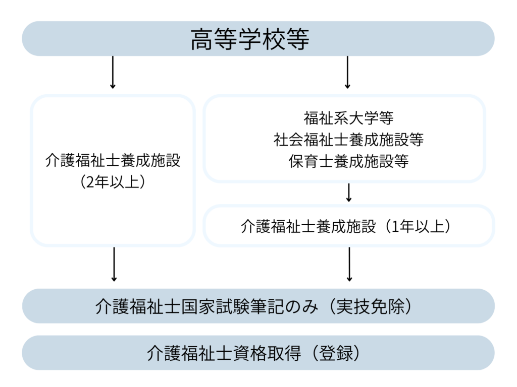 養成施設ルートは、高等学校や大学卒業後に厚生労働省指定の介護福祉士養成施設に1〜2年以上通って卒業することで受験資格を取得できるルートです。