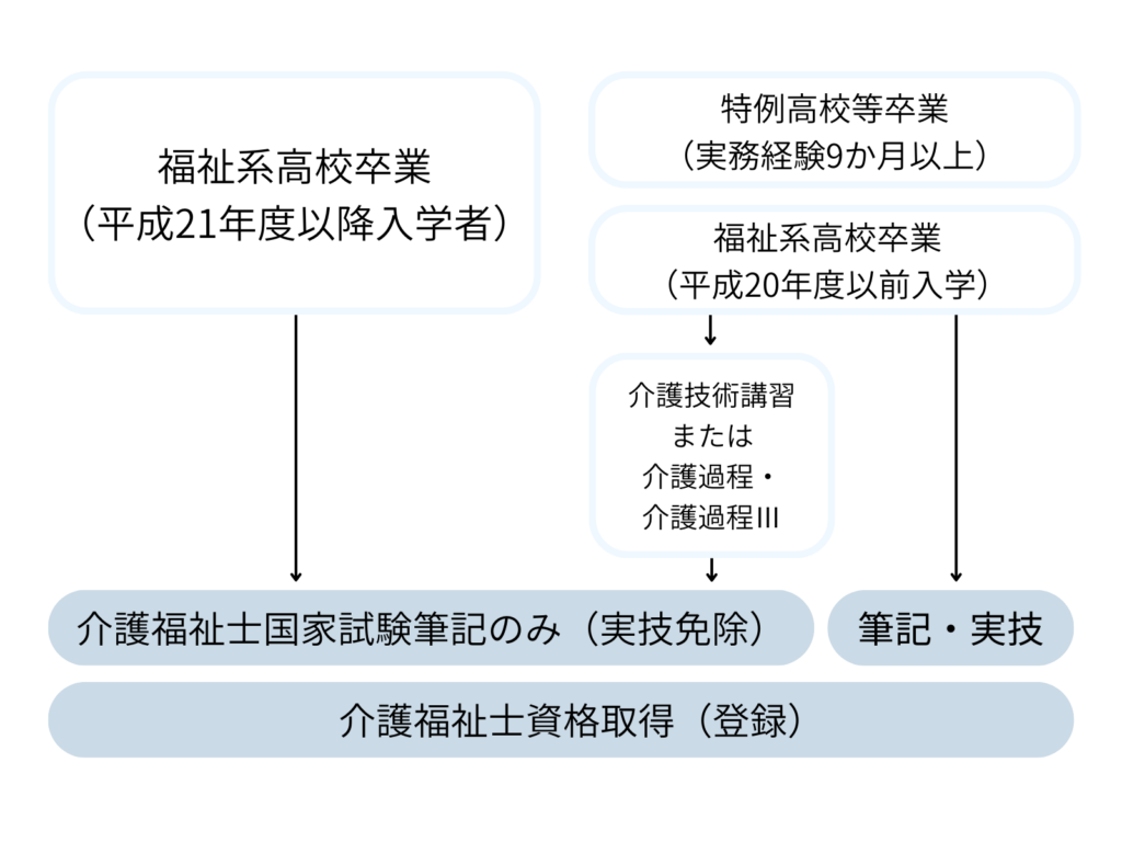 福祉系高校ルートでは、福祉に関する知識や技術を学ぶ福祉系高校を卒業したと同時に受験資格がもらえます。さらに国家試験では筆記のみで、実技試験が免除されます。