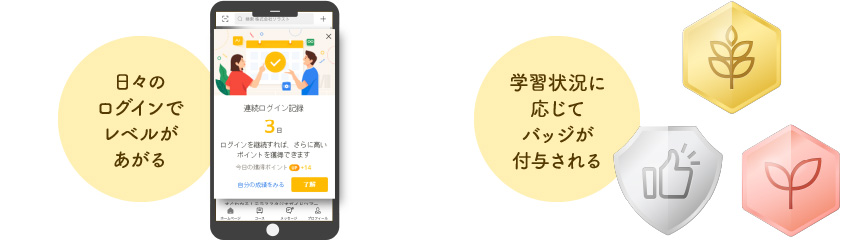 「テラススタジオ」では日々のログインや、学習状況(動画の視聴や課題の提出など)に 応じてポイントやバッジが獲得できます。ご自身の学習レベルを把握することで、モチベーションを保ちながら学習を継続できます。